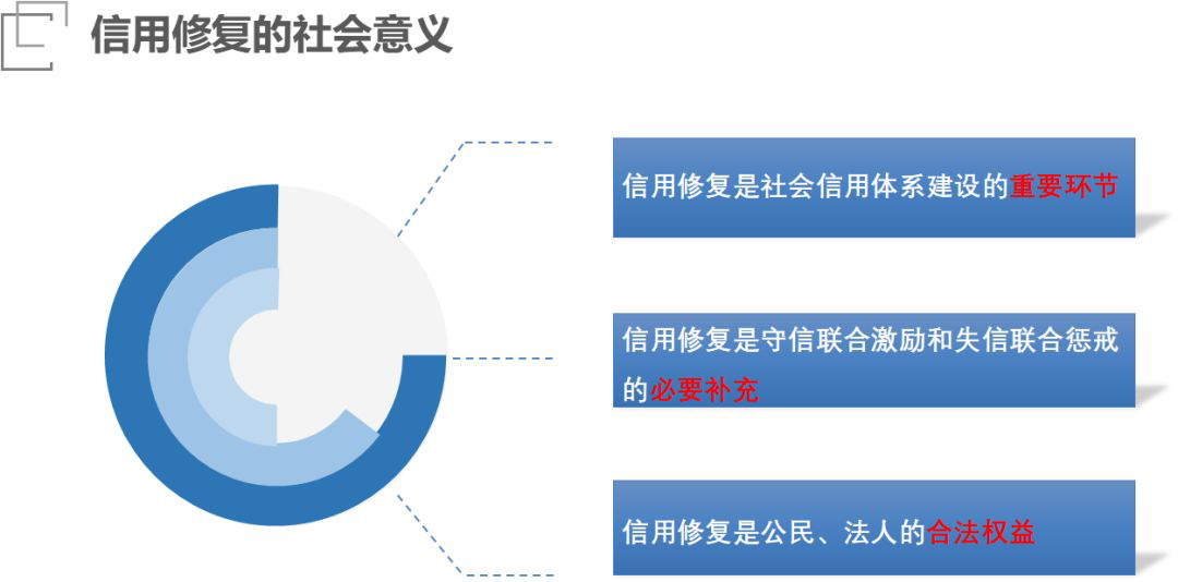 信用修复机制,既是给失信主体一个改正错误、重塑信用的机会,也是监管部门依法行政、增强服务意识的必然要求。通过实施信用修复,建立自我纠错、主动自新的社会鼓励与关爱机制,引导失信主体在规定期限内纠正失信行为、消除不良影响,有利于提高企业诚信经营和信用管理水平,保护信用主体的信用权益,营造诚实守信的社会氛围。