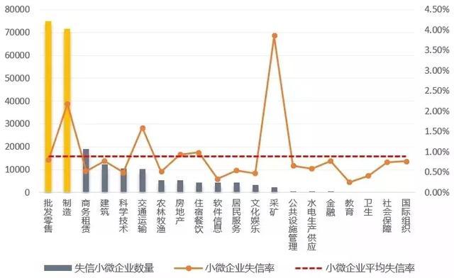 从各行业小微企业失信率来看,采矿业、制造业、交通运输业失信率位列前三:采矿业小微企业仅有2,200多家失信,但失信率高达3.85%;制造业小微企业失信率为2.18%,失信企业量和失信率均排名第二;交通运输业小微企业失信率为1.60%。以上三个行业均远高于小微企业平均失信率0.89%,房地产、住宿餐饮业企业失信率略高于平均水平,其他多数行业都低于平均水平。见下图:
