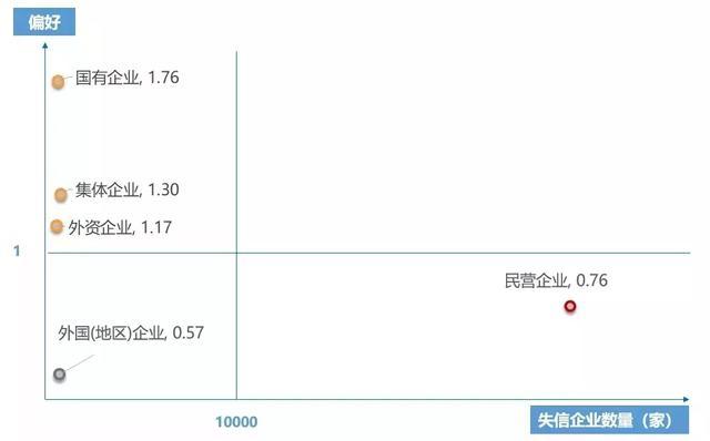 与行业分析类似,将某一类型的小微企业失信率与该类型的所有企业失信率进行对比,进行失信偏好分析。五大企业类型中,失信小微企业数量最多的民营企业,偏好值为0.76。国有企业、集体企业和外资企业的小微企业失信偏好值均大于1。