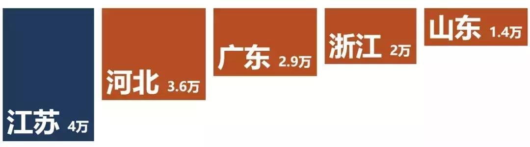全国失信小微企业区域分布如下图,31个省市均有涉及。失信小微企业数量最高的5个省份为:江苏、河北、广东、浙江和山东,数量分别为4万家、3.6万家、2.9万家、2万家、1.4万家,均超过一万,占全国失信小微企业的比例合计超过60%。