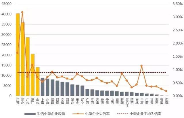 对比以上5省小微企业的失信率,广东和山东分别为0.73%、0.71%,低于小微企业平均失信率0.89%;而河北、江苏、浙江分别为3.18%、1.63%、1.17%,远高于全国小微企业平均失信率。其他省市失信小微企业数量相对较少,但值得注意的是,宁夏、福建两个省的小微企业失信率高于平均失信率。尤其宁夏,失信小微企业数量仅1,200多家,失信率达到1.13%,而福建失信小微企业数量8000多家,企业失信率为0.91%,略高于平均失信率。
