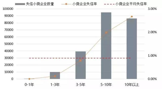 成立时间越久的企业,失信率相对更高,各年龄段的小微企业中,成立时间在5年以上的群体失信率均超过了小微企业平均失信率。