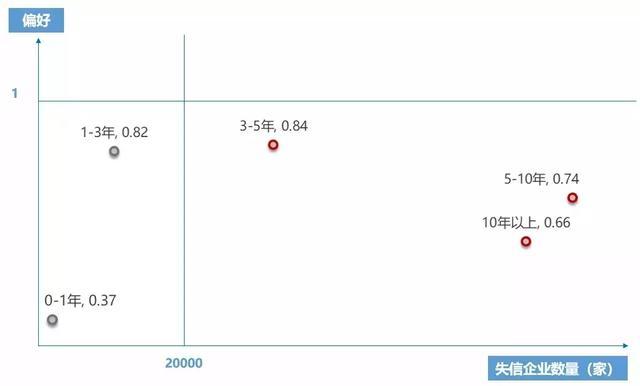 从偏好值来看,各个年龄段的偏好值均小于1,即各年龄段小微企业的信用状况要略好于该年龄段的所有企业。