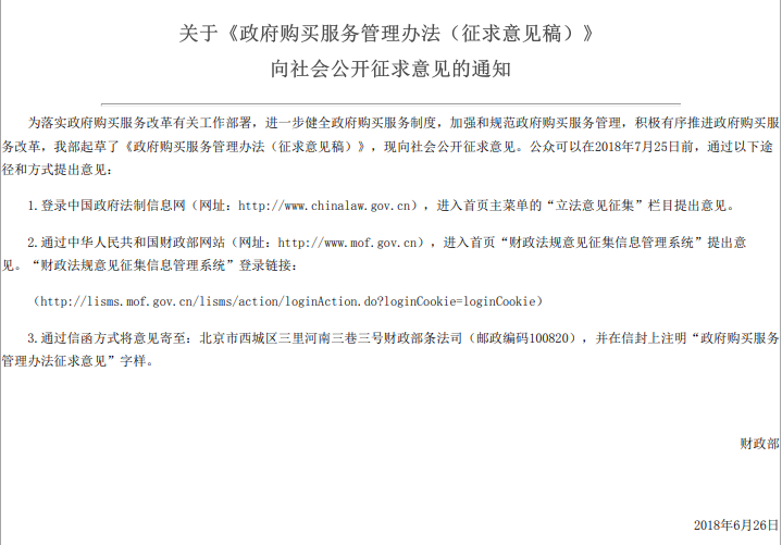 近日,财政部公布《政府购买服务管理办法(征求意见稿)》(下称《办法意见稿》),进一步规范了政府购买服务行为,其中设立了政府购买服务内容负面清单,明确了法律规定的货物、工程,服务与工程打包的项目,融资行为等不得作为政府购买服务的内容并列入指导性目录。